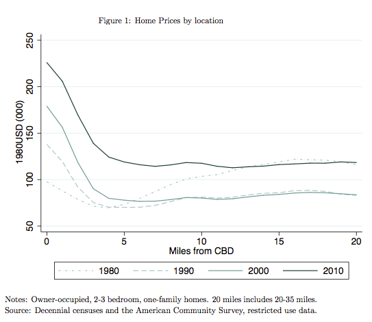 The slowing of urban growth, moreover, doesn’t so much reflect any diminished demand for urban living–quite the opposite. We’re bumping up against the limits of the capacity of the existing urban housing stock to accomodate more residents. In the early days of the urban rebound, there was arguably a fair amount of slack in city housing markets. But the renewed and steady growth of cities has–as everyone has observed–led demand to outstrip supply, driving up rents and heightening concerns about affordability. At least some of what gets treated as the “revealed preference” for suburbs, is actually households that would gladly choose urban living–if it hadn’t gotten so pricey. This shows up in the steepening of the rent gradient: households are paying a higher premium to live closer to the urban center; a finding illustrated by Lena Edlund and her colleagues and Columbia: